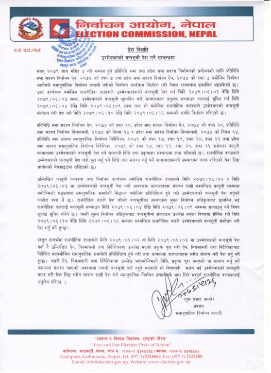 यस्तै दलहरुले बन्दसूची सच्याएर असोज १० देखि १६ गतेसम्म पेश गर्नुपर्ने छ ।