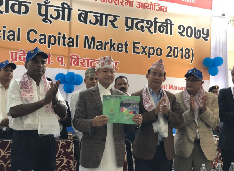 बोर्डकै अायोजनामा बिराटनगरमा पूँजीबजार प्रदर्शनी भएको हो । प्रदर्शनीको उद्घाटन गर्दै प्रदेश १ का मूख्यमन्त्री शेयरधन रार्इले धितोपत्र बजारलार्इ पूँजी परिचालनका लागि शक्तिशाली माध्यमका रूपमा विकास र विस्तार गर्नुपर्ने तर्क राखे ।