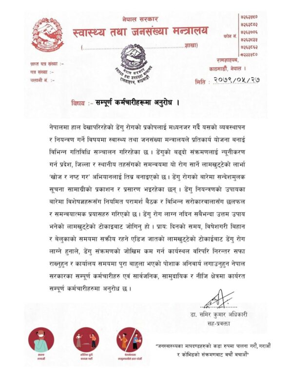 डेंगुको बढ्दो संक्रमणलाई न्यूनीकरण गर्न प्रदेश, जिल्ला र स्थानीय तहसँगको समन्वयमा यो रोग सार्ने लामखुट्टेको लार्भा ‘खोज र नष्ट गर’ अभियानलाई तीव्र बनाइएको मन्त्रालयले उल्लेख गरेको छ ।