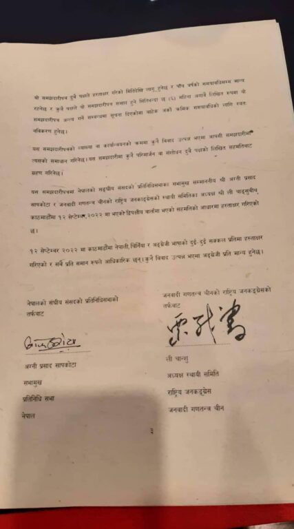 सभामुख अग्नि सापकोटा र नेपाल भ्रमणमा रहेका चीनको राष्ट्रिय जनकांग्रेसका प्रमुख ली चान्सुले समझदारीमा हस्ताक्षर गरेका हुन् ।