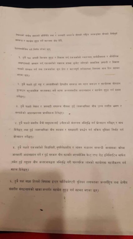 ४. दुवै पक्षले संसदीय मैत्री समूहहरुलाई उनीहरुको संलग्नता अभिवृद्धि गर्न प्रोत्साहन गर्नेछन् र साथ दिनेछन् तथा दुई व्यवस्थापिका बीच सदभाव र समझदारी प्रवर्द्धन गर्न सक्रिय भूमिका निर्वाह गर्न प्रोत्साहन गर्नेछन् ।