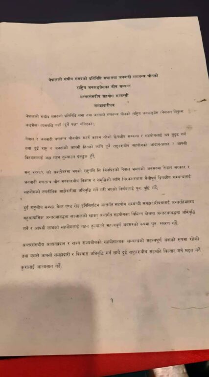 ५. दुबै पक्षले एकअर्काको विधायिकी, सुपरिवेक्षकीय र शासन सञ्चालन सम्बन्धी अभ्यासका वारेमा जानकारी आदानप्रदान गर्ने र दुई सरकार बीच सहमति भएबमोजिम बेल्ट एण्ड रोड इनिसिएटिभ मार्फत समेत दुई राष्ट्रहरु बीच अन्तरआवद्धता अभिवृद्धि गरी पारस्परिक लाभको सहयोगमा सहजीकरण गर्न महत्व दिनेछन् ।