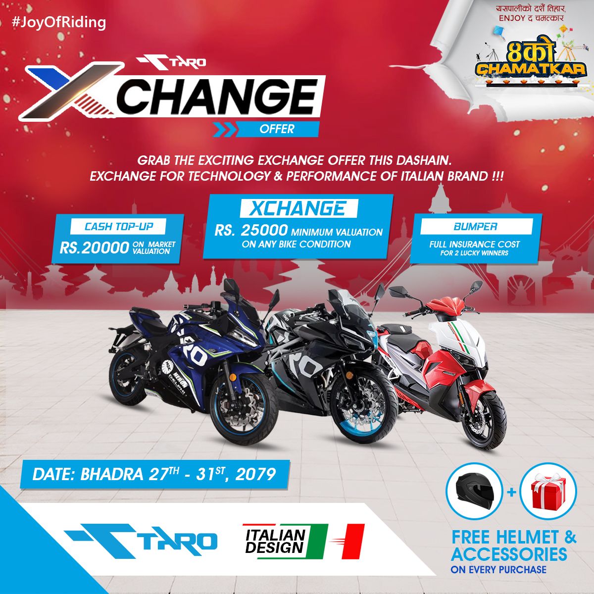 एस.जि ग्रुप अन्तर्गत नेपालका लागि आधिकारिक वितरक मोटरहेड तथा टारो ब्राण्डमा लागू हुने गरी भोलिको मिति २०७९ भाद्र २७ गते बाट २०७९ भाद्र ३१ गते सम्म Exchange Camp सञ्चालन गरेको छ जसमा जस्तोसुकै अवस्थाको वाइकहरुमा कम्तिमा रु.२५,०००।–को मुल्याङकन हुनेछ र जुनसुकै व्राण्डको वाइक संग Exchange मा वजार मुल्याङकन भन्दा रु.२०,०००।– हुनेछ । साथै वम्पर अफरमा २ जना भाग्यशाली विजेतालाई कम्पनीबाट Full Insurance छुट हुनेछ । यो अफर काठमाण्डौं उपत्यका भित्र धोविघाट, बालाजु, सल्लाघारी, चावहिल र टेकु गरी ६ वटा शोरुममा लागु हुनेछ । यसका साथ साथै कम्पनीले दशैं तिहार र छठ अफर अन्तर्गत यही १९ भाद्र २०७९ बाट १५ कार्तिक २०७९ सम्म लागू हुने गरी आफ्नो “४ को चमत्कार, वाइक पनि वचत पनि अफर सार्वजनिक गरेको छ । कम्पनीले मोटरहेड व्राण्डका वाइक खरीद गर्ने ग्राहकहरुलाई स्क्रयाच कार्ड मार्फत रु.७,९००।– देखि रु.१,००,०००।– जित्न सकिने अफरको साथै वम्परमा १ जना भाग्यशाली विजेताले रु.१,००,०००।– जित्न सक्ने अफर सार्वजनिक गरेको छ । यसका साथसाथै त्भपपभल द्दछण् पुरानो मोडलको खरीद जुनै पनि माध्यमबाट खरीद गर्दा सिधै रु.२५,०००।– छुटको व्यवस्था गरेको छ । टारो ब्राण्डका वाइक तथा स्कुटरको खरिदमा कम्पनीले आफ्नो ग्राहकहरुलाई उचित छुट दिई, छुट मार्फत वचत पनि हुने उद्देश्यले आफ्नो वाइकहरुमा रु.३०,०००।– सम्म नगद छुट तथा स्कुटरलको खरीदमा रु.१५,०००।– छुटको अफर अघि सारेका छन् । कम्पनीले वम्पर अफरमा गोला प्रथाद्धारा १ जना भाग्यशाली खरीदकर्ताले ५ वर्षको कर तथा विमा छुटको अफर पनि ल्याएको छ । ग्राहकहरुले कम्पनीको शोरुममा गई Test Ride तथाPose and Post Campaign अन्तर्गत फोटो खिची Like & Share गर्दा हातखाली नहुने उपहार समेत जित्न सक्नेछन् ।