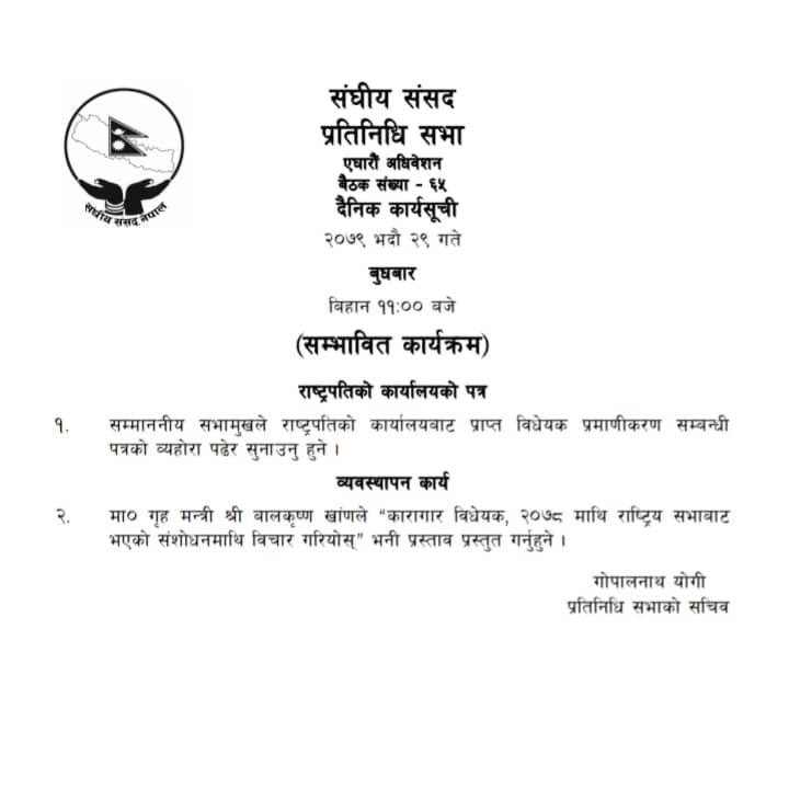 काठमाडौं । प्रतिनिधिसभाको बैठक बुधबार बस्दै छ । बुधबार बिहान ११ बजे बस्ने बैठकको सम्भावित कार्यसूची सार्वजनिक गरिएको छ ।