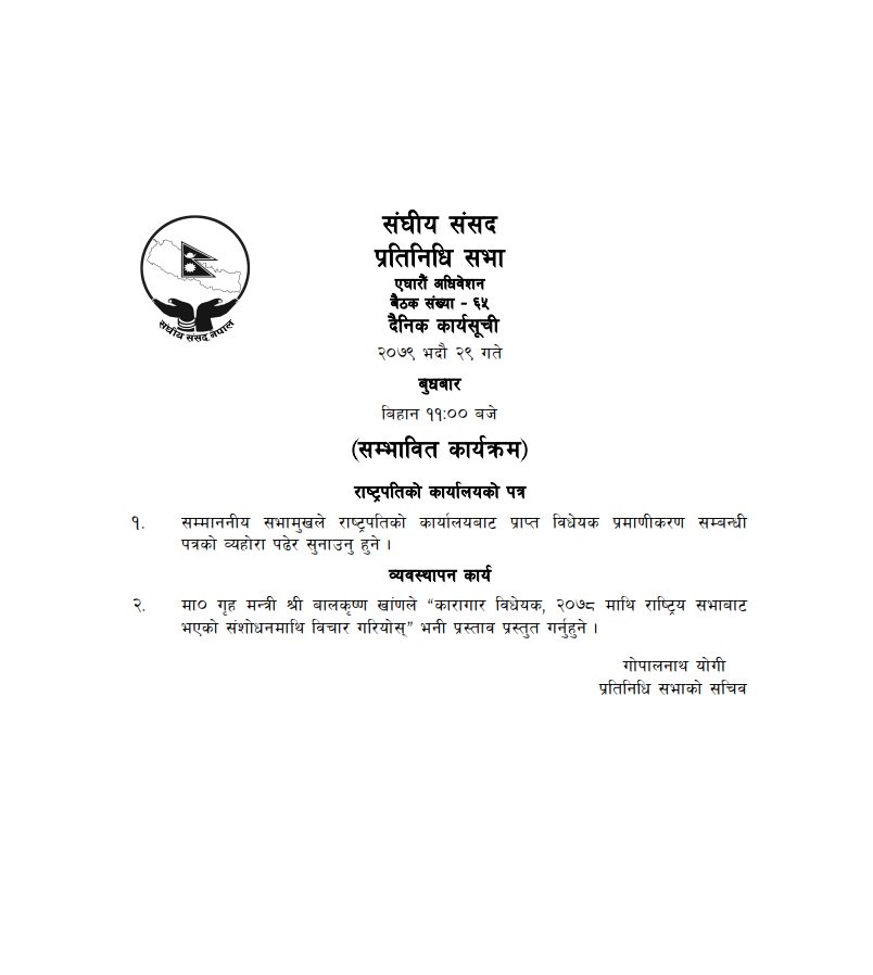 त्यसैगरी बैठकमा कारागार विधेयक, २०७८ माथि राष्ट्रिय सभाबाट भएको संशोधन प्रस्ताव प्रस्तुत गर्ने सम्भावित कार्यसूची रहेको संसद् सचिवालयका सचिव गोपालनाथ योगीद्वारा जारी विज्ञप्तिमा भनिएको छ । राष्ट्रिय सभा बैठक पनि आजै बिहान ११ बजे बस्ने कार्यसूची रहेको छ ।