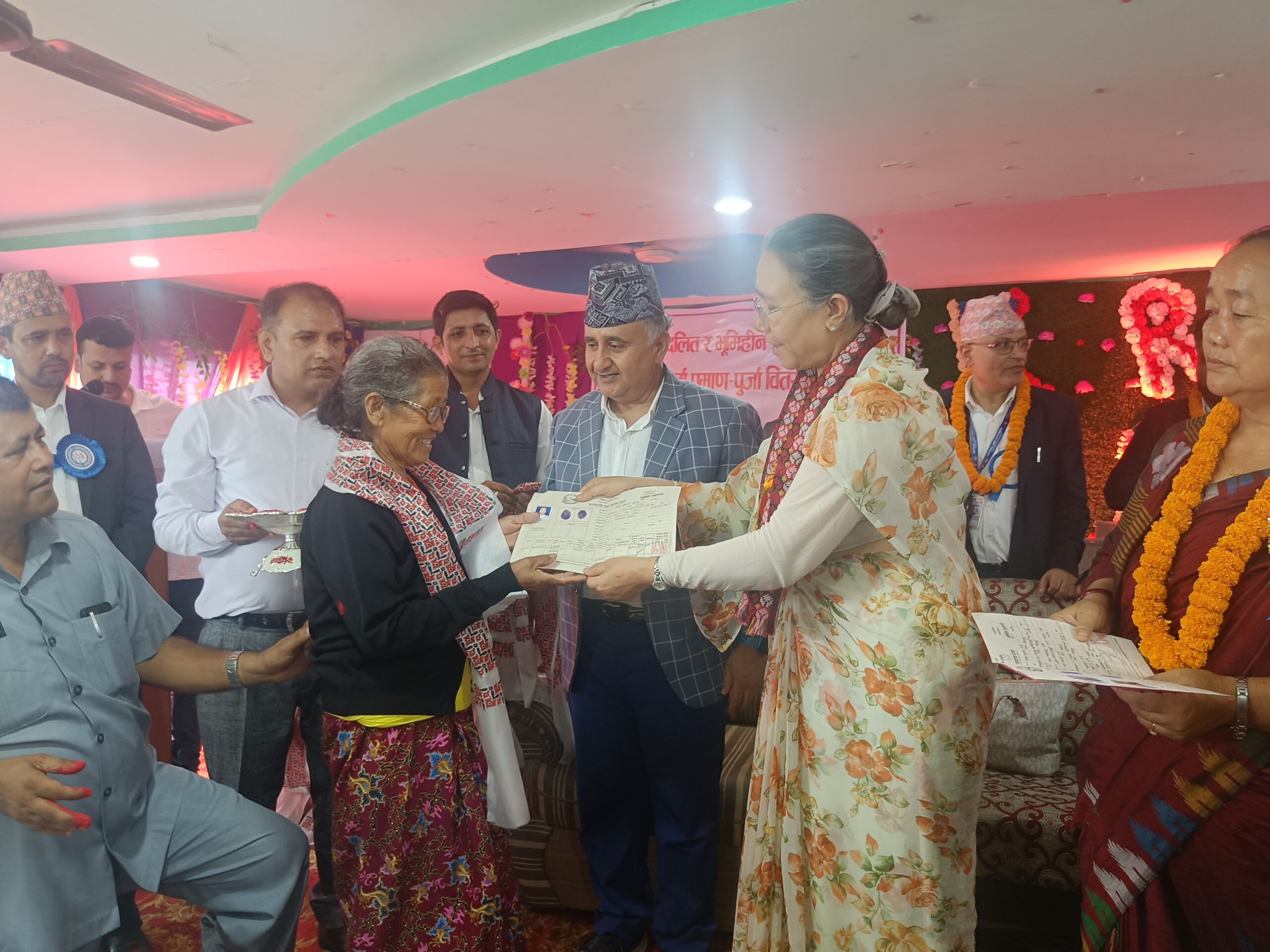 काठमाडौं । भूमि व्यवस्था, सहकारी तथा गरिबी निवारण मन्त्री शशी श्रेष्ठले आज मोरङको कानेपोखरी गाउँपालिकामा भूमिहीन सुकुम्वासी र भूमिहीन दलित गरेर ३६ वटा लालपूर्जा वितरण गरेकी छन् । राष्ट्रिय भूमि आयोग जिल्ला समिति मोरङ मार्फत कानेपोखरी गाउँपालिकाको वडा नम्बर ६ का २७ भूमिहीन सकुम्वासी र ९ भूमिहीन दलित घरपरिवारलाई मन्त्री श्रेष्ठले लालपूर्जा वितरण गरेकी हुन् ।