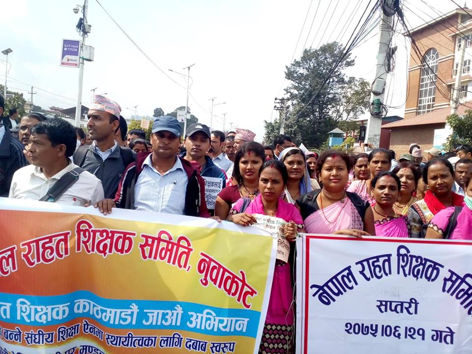 देशभरका राहत शिक्षकहरुले आईतबार काठमाडौंको माइतीघरमा भेला भई स्वतहः स्थायी गर्न माग गर्दै सरकारविरुद्ध प्रदर्शन गरेका हुन् ।