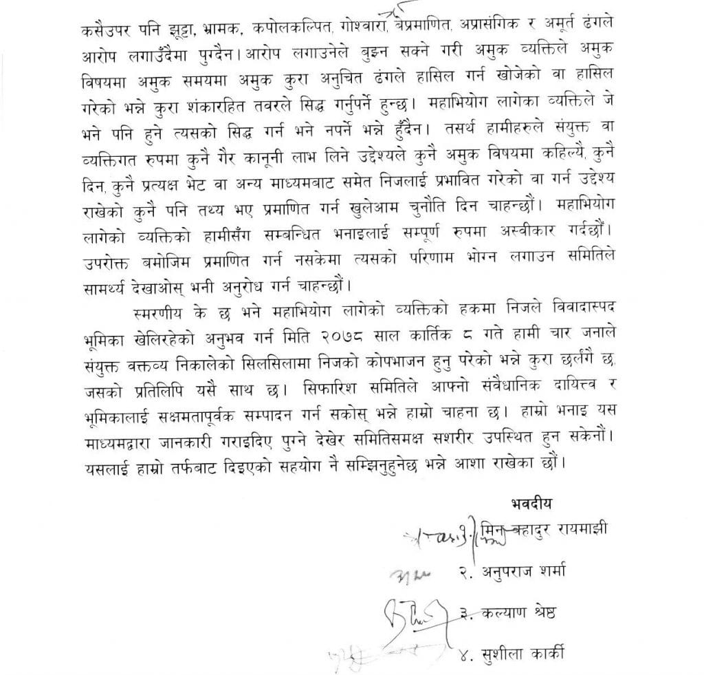 चार पूर्व प्रधानन्यायाधीशहरूले महाभियुक्तले आफूहरूमध्ये कसले, कहिले, कुन अमुक विषयमा महाभियुक्तलाई प्रभावित गर्न प्रयास गरेको हो, त्यस्तो सम्पर्क व्यक्तिगत वा के तहबाट भएको हो ? त्यो कहिले र कसरी भएको हो ? त्यसको यथार्थता पुष्टि हुने प्रमाण के हो ? त्यस्तो अमुक विषयमा के कस्तो नतिजा निक्लन गएको छ ? निजले आरोपित गरेको अमुक कुरा गर्ने व्यक्ति, विषय, समय सन्दर्भ र अभिलेख केही पनि सिफारिस समितिले मागेको र सोबमोजिमको सबुत प्रमाण निजले दिएको भन्ने कतै पनि देखिन नआएको हुँदा कसैउपर पनि झूट्टा, भ्रामक, कपोलकल्पित, गोश्वारा, बेप्रमाणित, अप्रासंगिक र अमूर्त ढंगले आरोप लगाउँदैमा पुग्दैन ।