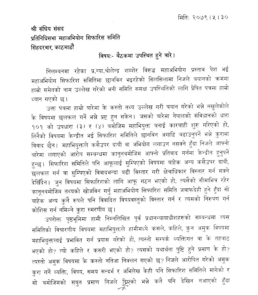 ‘उक्त पत्रमा हाम्रो बारेमा के कस्तो तथ्य उल्लेख गरी बयान गरेको भन्ने नखुलेकोले के विषयमा छलफल गर्ने भन्ने प्रष्ट हुन सकेन । जसको बारेमा नेपालको संविधानको धारा १०१ को उपधारा ९३० र ९४० बमोजिम महाभियुक्त बनाई कारबाही सुरु गरिएको हो, तिनैको विषयमा केन्द्रित भई सिफारिस समितिले छानबिन अगाडि बढाउनुपर्ने भन्ने कुरामा विवाद छैन ।