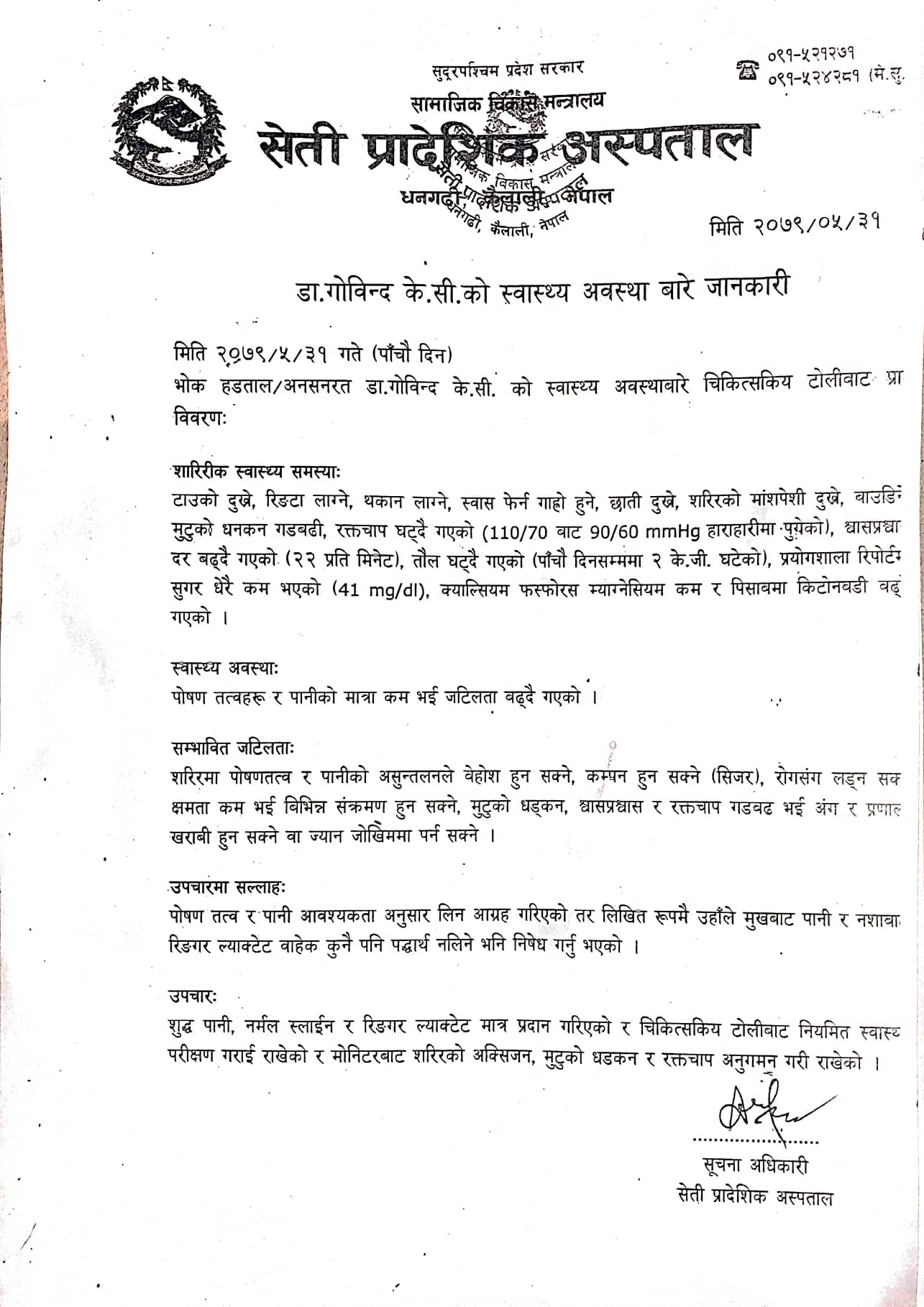 विभिन्न मागसहित धनगढीमा अनसनरत केसी अस्वस्थ्य भएसँगै बिहीबारबाट सेती प्रादेशीक अस्पताल धनगढीमा उपचाररत रहेका छन् ।