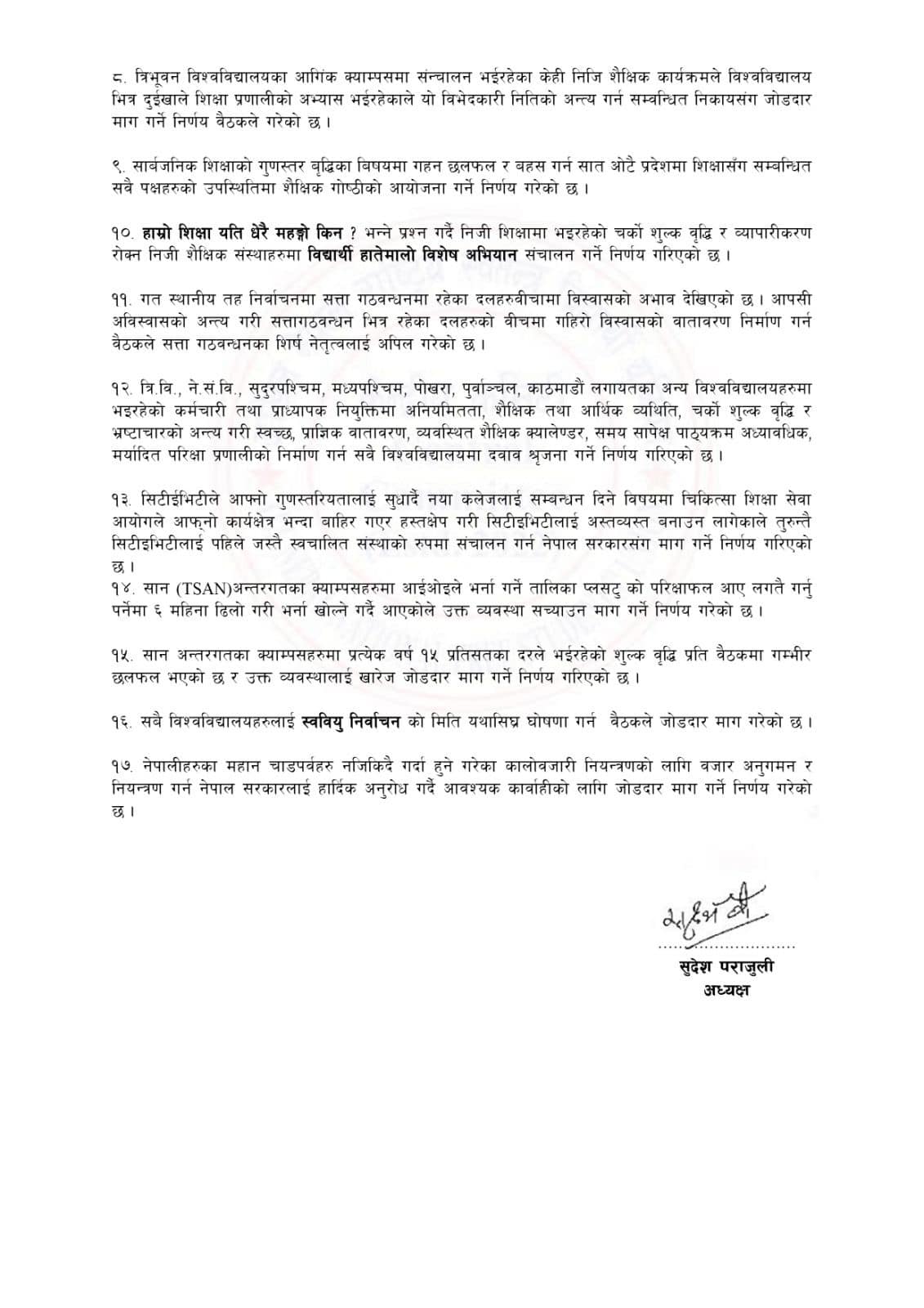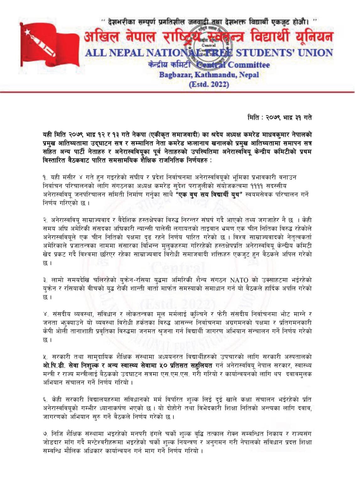 यस्तै सरकारी शैक्षिक संस्थामा अध्ययनरत विद्यार्थीहरूको उपचारको लागि सरकारी अस्पतालको ओपिडी सेवा निशुल्क र अन्य स्वास्थ्य सेवामा ५० प्रतिशत सहुलियत गर्नका लागि थप दबाब दिन सङ्गठनले अभियान नै चलाउने समेत निर्णय गरेको छ ।