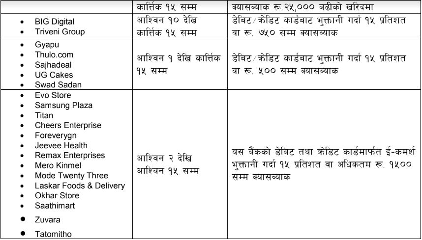 चाडपर्वहरूलाई लक्षित गर्दै बैंकले आफ्ना ग्राहकलाई डिजिटल कारोबारतर्फ प्रोत्साहन गर्न निम्नलिखित मर्चेन्टहरूमा आकर्षक छुट तथा क्यासब्याकको व्यवस्था गरेको छ ।
