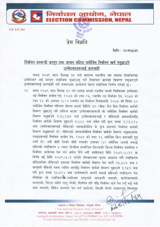 शुक्रवार एक विज्ञप्ति जारी गर्दै यसबारेमा निर्वाचन आयाेगले जानकारी गराएकाे हाे । विज्ञप्ति अनुसार १ लाख १४ हजार ९५८ उम्मेदवारहरूले ३० दिनभित्र खर्च विवरण बुझाएका थिएनन् । त्यस्तै ८ हजार ६६६ जनाले तोकिएको समयावधिपछि निर्वाचन खर्चको विवरण बुझाएका थिए । तर, ढीला खर्चको विवरण पठाउनुकाे कारणा अस्पष्ट भएसँगै उनीहरु पनि आयाेगकाे कारबाहीमा परेका हुन् ।