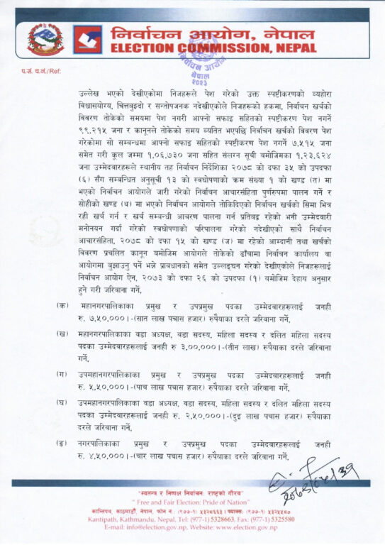 निर्वाचन खर्च समयमा नबुझाएका महानगरपालिकाका प्रमुख र उपप्रमुख पदका उम्मेदवारहरूलाई जनही सात लाख ५० हजार रुपैयाँका दरले र महानगरपालिकाका वडा अध्यक्ष, वडा सदस्य, महिला सदस्य र दलित महिला सदस्य पदका उम्मेदवारहरूलाई जनही तीन लाख रुपैयाँका दरले जरिबाना गर्ने निर्णय भएको आयोगले जनाएको छ ।