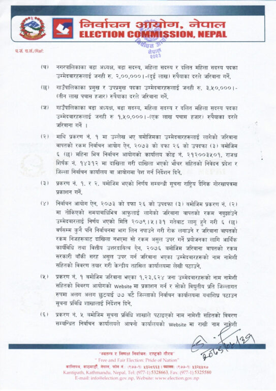 त्यस्तै नगरपालिकाका प्रमुख र उपप्रमुख पदका उम्मेदवारहरूलाई जनही चार लाख ५० हजार रुपैयाँका दरले जरिबाना गर्ने निर्णय भएको आयोगले जानकारी दिएको छ । नगरपालिकाका वडा अध्यक्ष, वडा सदस्य, महिला सदस्य र दलित महिला सदस्य पदका उम्मेदवारहरूलाई जनही दुई लाख रुपैयाँका दरले जरिबाना गर्नेछ ।