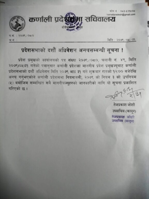 मुख्यमन्त्री तथा मन्त्रिपरिषद्को कार्यालयले प्रदेश सभाको दशौंं अधिवेशन अन्त्य गर्नका लागि प्रदेश प्रमुखलाई सिफारिस गरेको थियो । सोहीअनुसार प्रदेश प्रमुख तिलक परियारले अधिवेशन अन्त्य गरेका प्रदेश सभा सचिवालयका उपसचिव (कानुन) तेजप्रकाश जोशीले जानकारी दिए ।