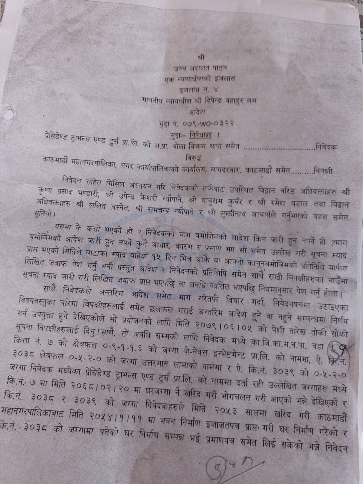 उच्च अदालतले जेनेक्स इन्भेस्टेमन्ट, उत्तरमान लामा र प्रेसिडेन्ट ट्राभल्स एन्ड टुर्सका नाममा रहेको काठमाडौं महानगरपालिका वडा नम्बर ७ स्थित कित्ता नम्बर ७, ३०३८ र ३०३९ को जग्गामाथि बनेका घरहरू कानुनी रित नपुर्‍याई र उचित क्षतिपूर्ति नदिई नभत्काउन भनेको हो ।