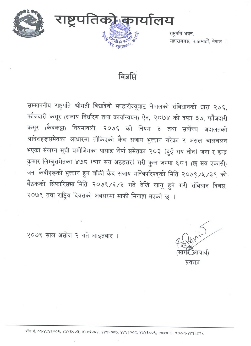 ‘राष्ट्रपति विद्यादेवी भण्डारीबाट नेपालको संविधानको धारा २७६, फौजदारी कसूर (सजाय निर्धारण तथा कार्यान्वयन) ऐन, २०७४ को दफा ३७, फौजदारी कसूर (कैदकट्टा) नियमावली, २०७६ को नियम ३ तथा सर्वोच्च अदालतको आदेशहरूसमेतका आधारमा तोकिएको कैद सजाय भुक्तान गरेका र असल चालचलन भएका संलग्न सूची बमोजिमका पासाङ शेर्पा समेतका २०३ जना र इन्द्र कुमार लिम्बुसमेतका ४७८ गरी कुल जम्मा ६८१ जना कैदीहरूको भुक्तान हुन बाँकी कैद सजाय मन्त्रिपरिषद्को मिति २०७९/५/३१ को बैठकको सिफारिसमा मिति २०७९/६/३ गते देखि लागु हुने गरी संविधान दिवस, २०७९ तथा राष्ट्रिय दिवसको अवसरमा माफी मिनाहा भएको छ,’ प्रवक्ता आचार्यले जारी गरेको विज्ञप्तिमा उल्लेख छ ।