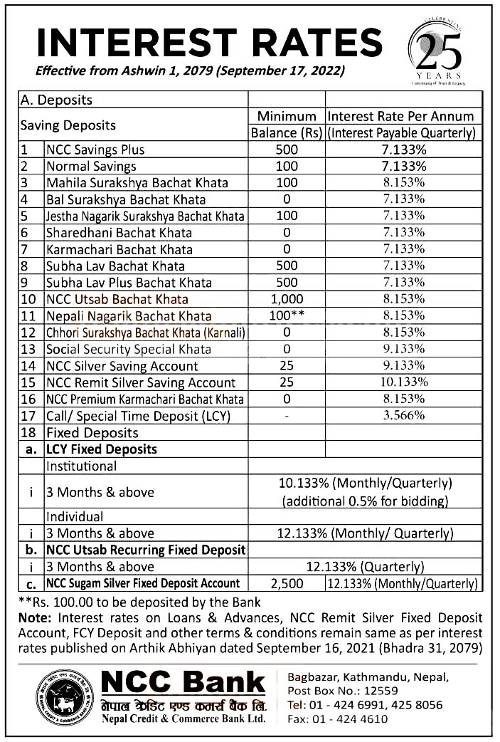 बैंकले उक्त दिन सार्वजनिक गरेको नयाँ ब्याजदरमा मुद्दती खाताअन्तर्गतको एनसीसी सुगम सिल्भर मुद्दती खातामा १५ प्रतिशतसम्म ब्याजदर निर्धारण गरेको थियो । बैंकले आज पुनः प्रकाशन गरेको ब्याजदरमा उक्त खाताको ब्याजदर घटाएर १२.१३ प्रतिशत कायम गरेको छ ।