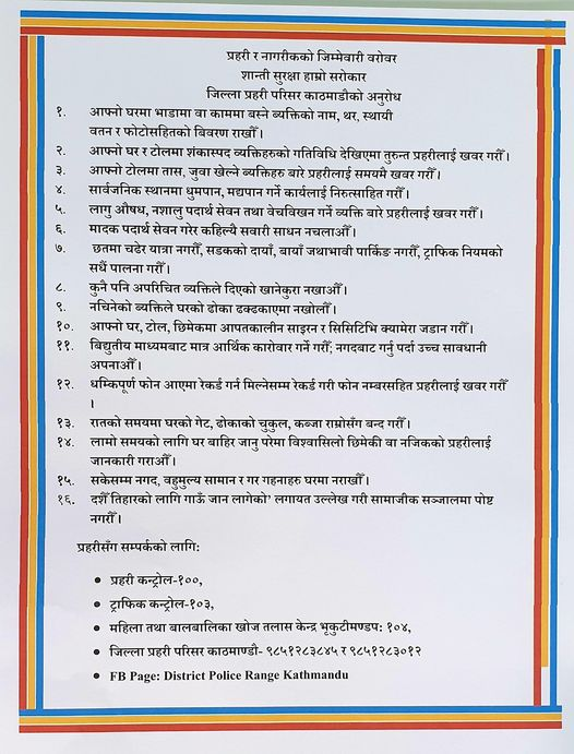 प्रहरीको सहायता चाहिएमा प्रहरी कन्ट्रोल १००, ट्राफिक कन्ट्रोल १०३, महिला तथा बालबालिका खोज तलास केन्द्र भृकुटीमण्डप १०४ तथा जिल्ला प्रहरी परिसर काठमाडौंको ९८५१२८३८४५२ र ९८५१२८३०१२ नम्बरमा सम्पर्क गर्न आग्रह गरिएको छ ।