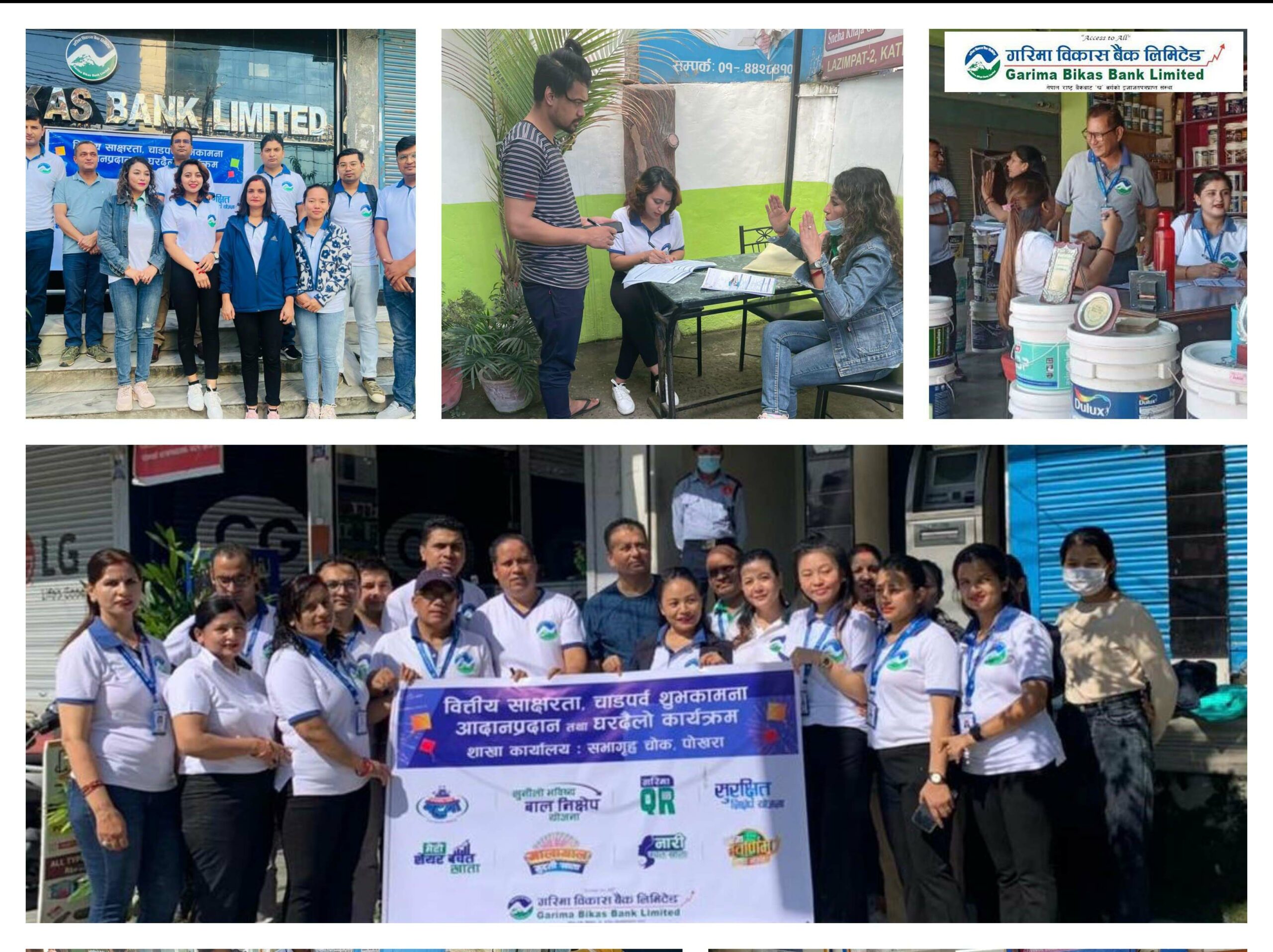गरिमा विकास बैंकले आश्विन ३ गते संविधान दिवसको दिन पारेर आफ्ना सबै १२० शाखा कार्यालयहरु र १ एक्स्टेन्सन काउण्टरबाट वृहत वित्तिय साक्षरता एवं घरदैलो कार्यक्रम तथा चाडपर्वको शुभकामना आदान–प्रदान कार्यक्रम सफलताका साथ सम्पन्न गरेको छ । उक्त कार्यक्रम अन्तर्गत बैंकका प्रमुख कार्यकारी अधिकृत, नायव प्रमुख कार्यकारी अधिकृत एवं सम्पूर्ण विभागीय प्रमुख लगायत एक हजार कर्मचारीहरु मार्फत नेपालभर करिब ५०,००० ग्राहकहरुलाई विभिन्न बैकिङ्ग सेवा प्रदान गरेको छ।