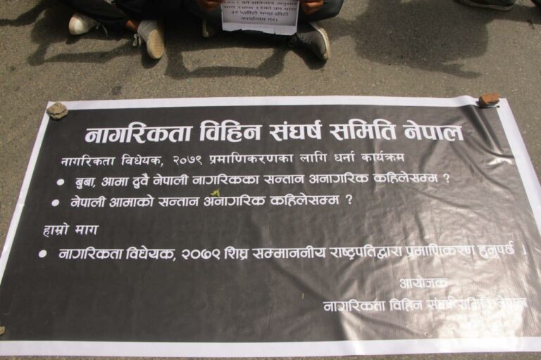 ‘बुबाआमा दुवै नेपाली नागरिकका सन्तान अनागरिक कहिलेसम्म ? नेपाली आमाको सन्तान अनागरिक कहिलेसम्म रु’ जस्ता ब्यानरर प्लेकार्डसहित समितिले धर्ना दिएको छ ।