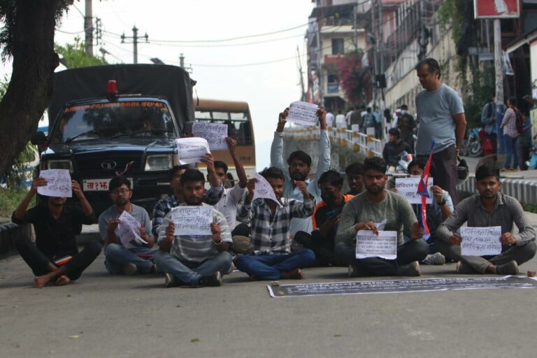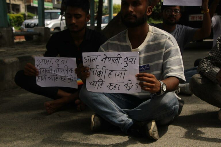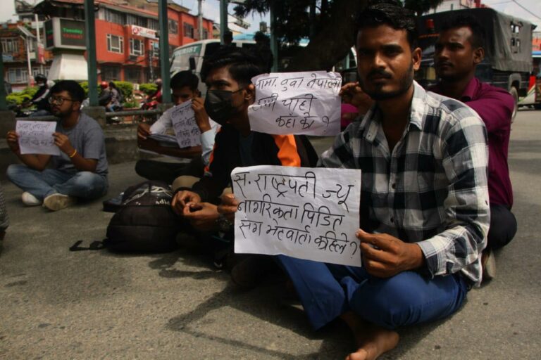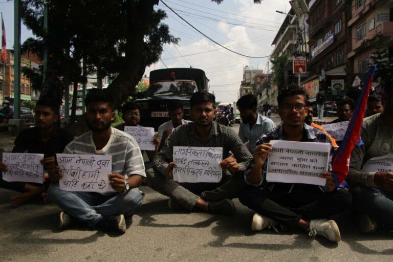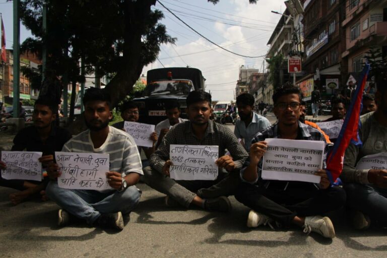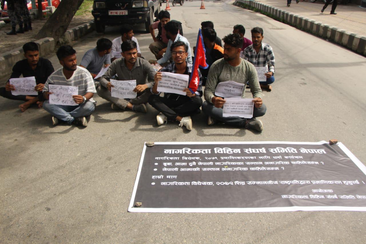 ‘बुबाआमा दुवै नेपाली नागरिकका सन्तान अनागरिक कहिलेसम्म ? नेपाली आमाको सन्तान अनागरिक कहिलेसम्म रु’ जस्ता ब्यानरर प्लेकार्डसहित समितिले धर्ना दिएको छ ।