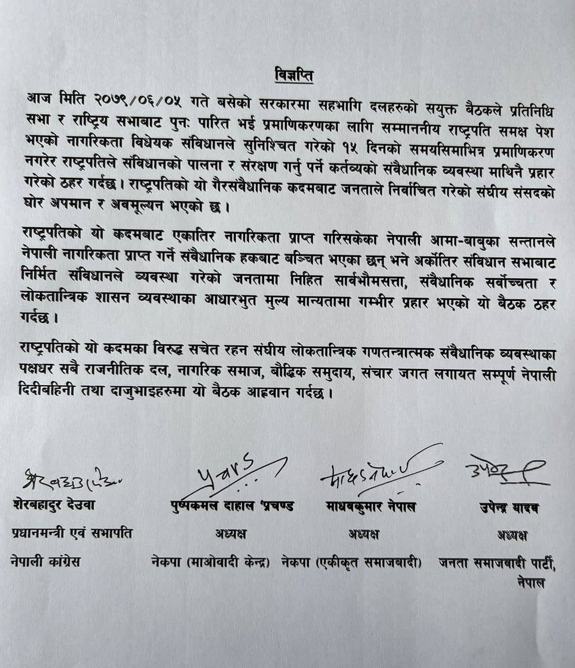 काठमाडौं । सरकारमा सहभागि दलहरूको बुधवार बसेको संयुक्त बैठकले प्रतिनिधि सभा र राष्ट्रिय सभाबाट पुनः पारित भई प्रमाणीकरणका लागि राष्ट्रपति समक्ष पेश भएको नागरिकता विधेयक प्रमाणीकरण नगरेर राष्ट्रपतिले संवैधानिक व्यवस्था माथि नै प्रहार गरेको ठहर गरेको निस्कर्ष निकालेको छ ।
