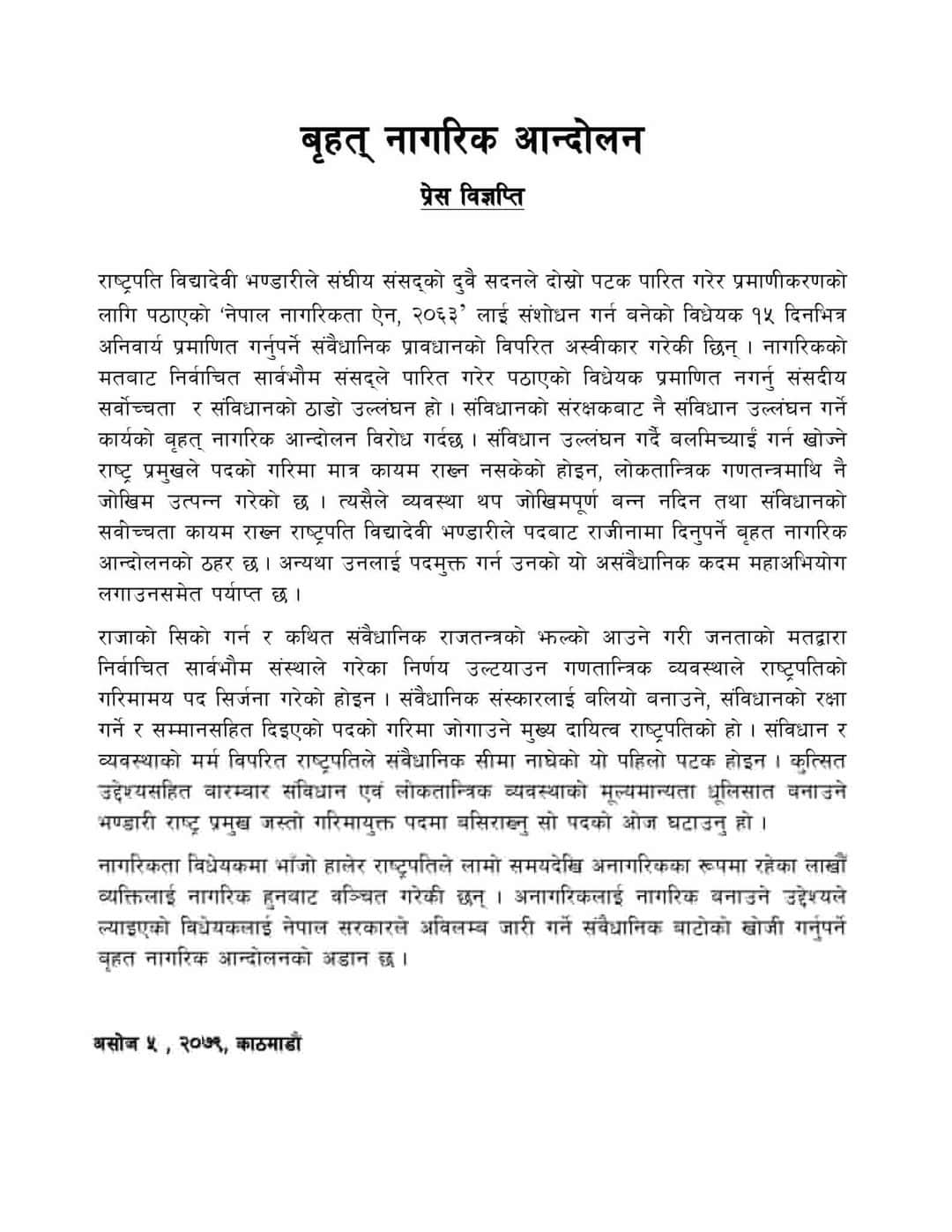 नभए उनलाई पदमुक्त गर्न महाभियोग लगाउनुपर्ने माग गरिएकव छ । ‘राजाको सिको गर्न र कथित संवैधानिक राजतन्त्रको झल्को आउने गरी जनताको मतद्वारा निर्वाचित सार्वभौम संस्थाले गरेका निर्णय उल्ट्याउन गणतान्त्रिक व्यवस्थाले राष्ट्रपतिको गरिमामय पद सिर्जना गरेको होइन,’ नागरिक आन्दोलनले जारी गरेको विज्ञप्तिमा भनिएको छ ।