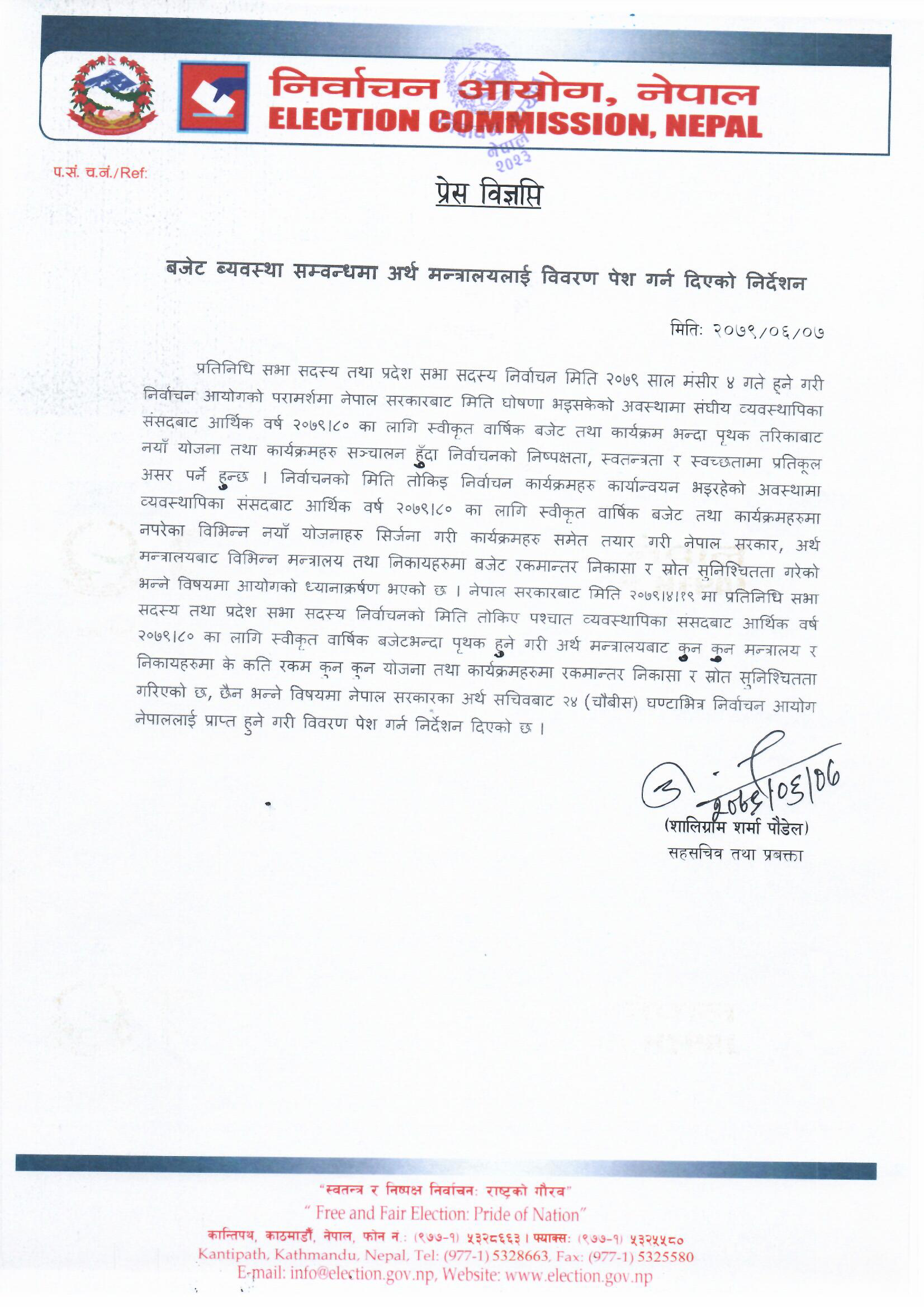 ‘सरकारबाट साउन १९ मा प्रतिनिधि सभा सदस्य तथा प्रदेश सभा सदस्य निर्वाचनको मिति तोकिए पश्चात व्यवस्थापिका संसदबाट आर्थिक वर्ष २०७९/८० का लागि स्वीकृत वार्षिक बजेटभन्दा पृथक हुने गरी अर्थ मन्त्रालयबाट कुन कुन मन्त्रालय र नियकाहरुमा के कति रकम कुन कुन योजना तथा कार्यक्रमहरुमा रकमान्तर निकासा र स्रोत सुनिश्चितता गरिएको छ, छैन भन्ने विषयमा अर्थ सचिवबाट २४ घण्टाभित्र निर्वाचन आयोग नेपाललाई प्राप्त हुने गरी विवरण पेश गर्न निर्देशन दिइएको छ,’ आयोगले आज जारी गरेको विज्ञप्तिमा उल्लेख छ ।
