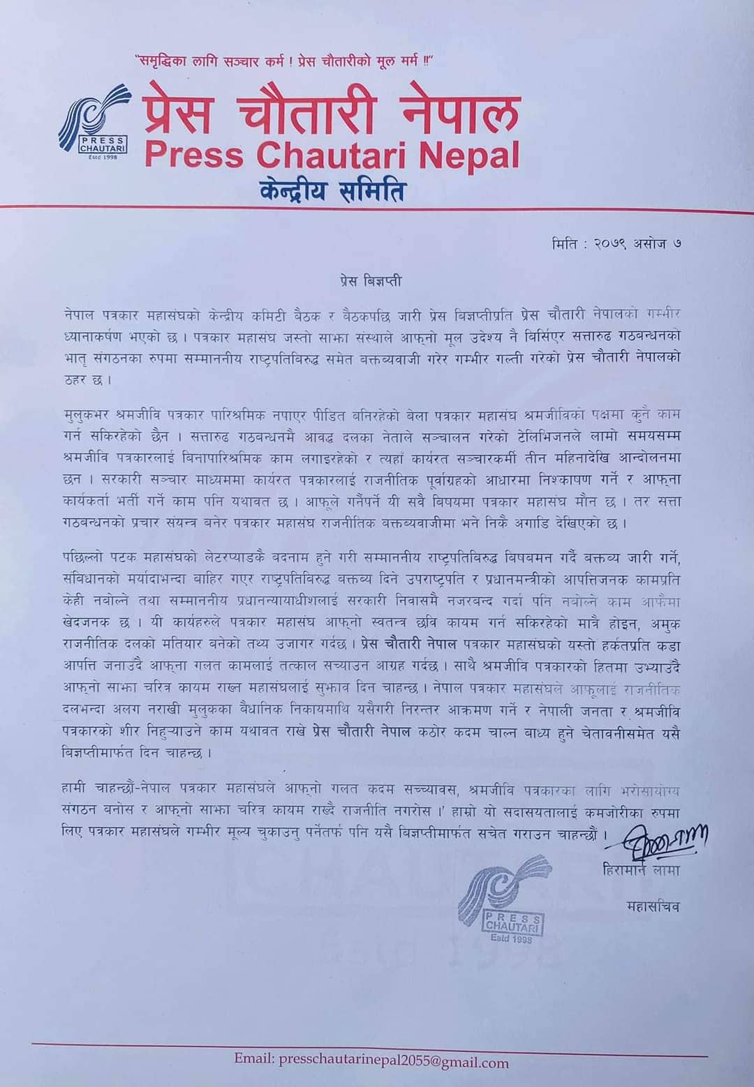 ‘पत्रकार महासंघ जस्तो साझा संस्थाले आफनो मूल उद्देश्य नै बिर्सिएर सत्तारुढ गठबन्धनको भ्रातृ संगठनका रुपमा सम्माननीय राष्टपतिविरुद्ध समेत बक्तव्यवाजी गरेर गम्भीर गल्ती गरेको प्रेस चौतारी नेपालको ठहर छ।’