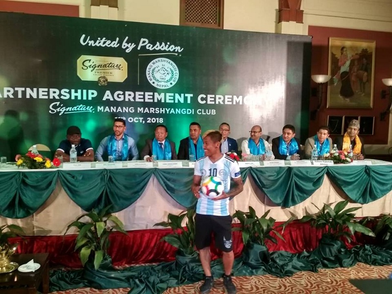 काठमाडौं । ‘ए’ डिभिजन लिग क्लब मनाङ मस्र्याङ्दी क्लबलाई प्रिमियम ह्विस्की ब्रान्ड सिग्नेचरले मुख्य प्रायोजन गरेको छ ।