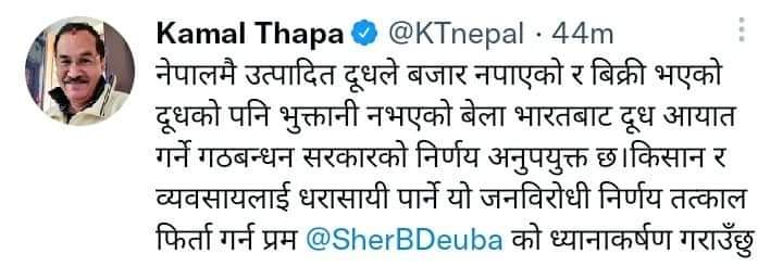 थापाले भनेका छन् – ‘नेपालमै उत्पादित दूधले बजार नपाएको र बिक्री भएको दूधको पनि भुक्तानी नभएको बेला भारतबाट दुध आयात गर्ने गठबन्धन सरकारको निर्णय अनुपयुक्त छ। किसान र व्यवसायलाई धरासायी पार्ने यो जनविरोधी निर्णय तत्काल फिर्ता गर्न प्रम शेर बहादुर देउवाको ध्यानाकर्षण गराउँछु ।’