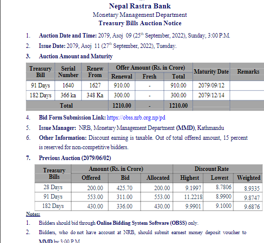 काठमाडौं । नेपाल राष्ट्र बैंकले १२ अर्ब १० करोड रुपैयाँको ट्रेजरी बिल जारी गर्ने भएको छ । राष्ट्र बैंकले ९१ दिन र १८२ दिनको लागि ट्रेजरी बिल जारी गर्न लागेको हो ।