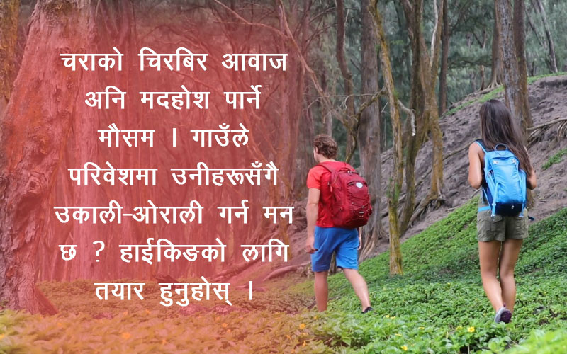 निलो आकाश, चिसो बतास, चराको चिरबिर आवाज, अनि मदहोश पार्ने मौसम । त्यसमाथी आफ्नो आँखाले कहिल्यै नदेखेका रोचक अनि घमाईलो ठाउँ । त्यसमाथी गाउँको परिवेश, खुलेका मुस्कान । ति मुस्कानका धनीहरुसँग सँगै पसिना चुहाउँदै उकाली–ओराली गर्न मन छ ?
