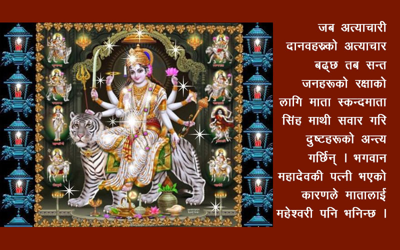 काठमाडौं । आज बडादशैँको पाँचौं दिन । देशभरका दुर्गा देवीको मन्दिरमा पूजा आधार गरि मनाइँदै छ । आज दशैँको पाँचौं दिन स्कन्दमाताको पूजा गरिन्छ ।