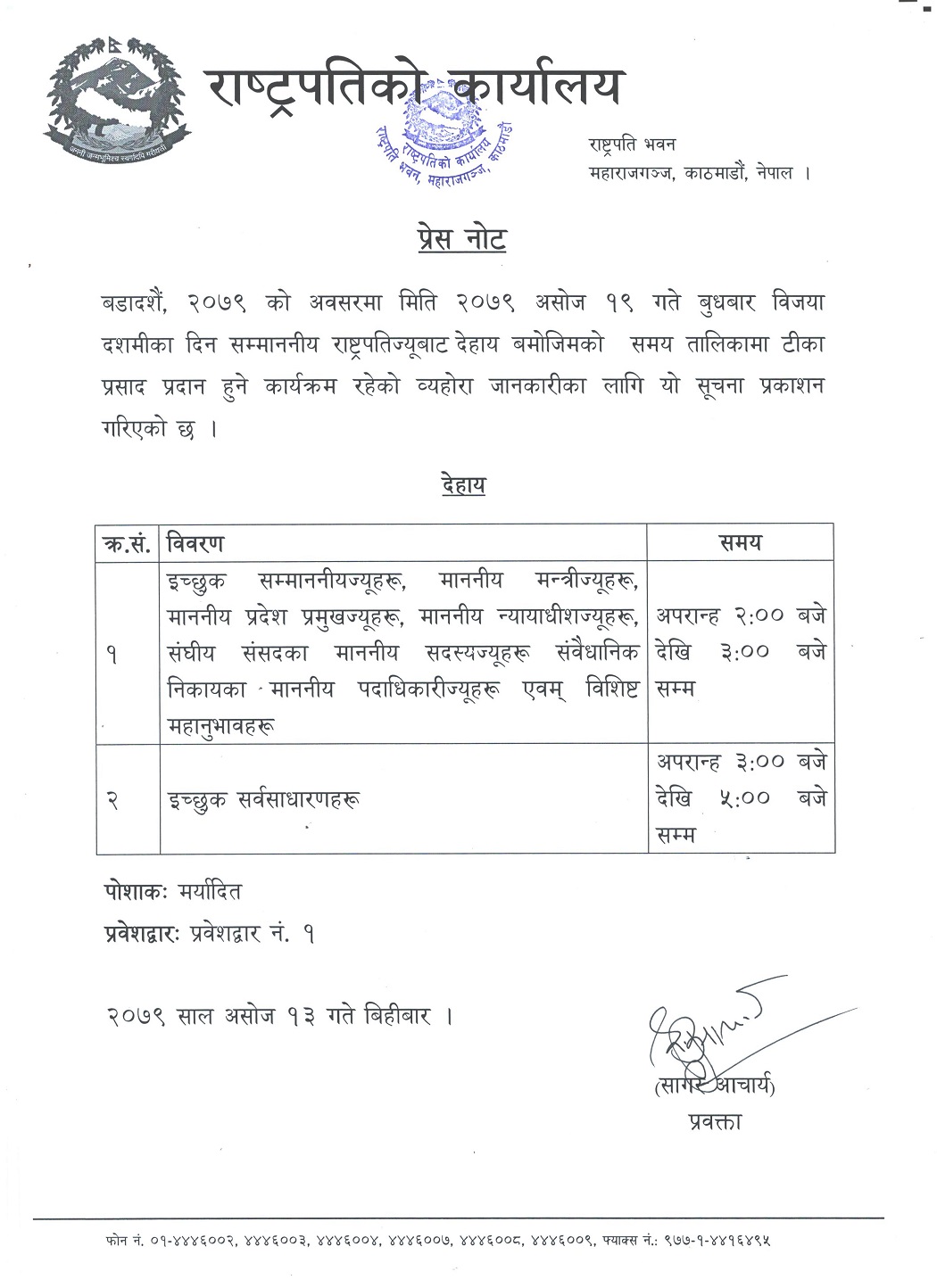 उनका अनुसार विजया दशमीका दिन १९ असोजमा दिउँसो २ देखि अपरान्ह ३ बजेसम्म उच्च पदस्थ व्यक्तिहरुलाई र सोही दिन अपरान्ह ३ बजेदेखि ५ बजेसम्म सर्वसाधारणलाई बडादसैँको टीका लगाइदिने कार्यक्रम तय गरिएको छ ।