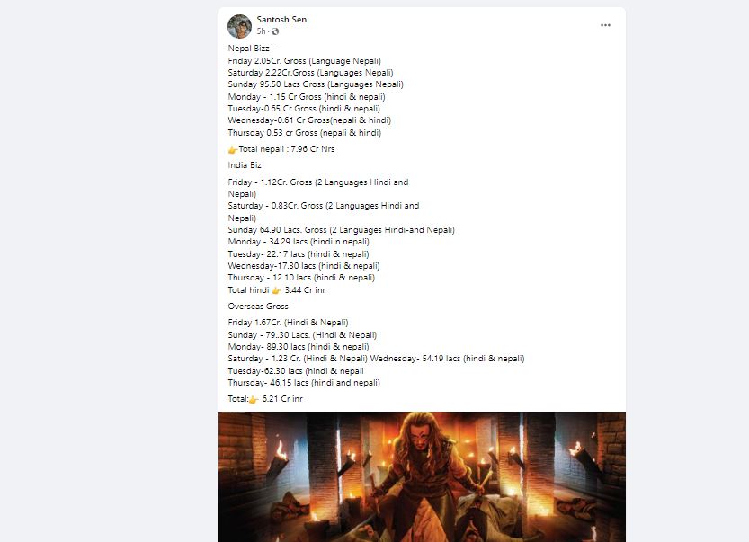 निर्माता तथा निर्देशक सन्तोष सेनले गत शुक्रबारदेखि बिहीबारसम्मको कमाइ सामाजिक सञ्जालबाट सार्वजनिक गरेका हुन् ।