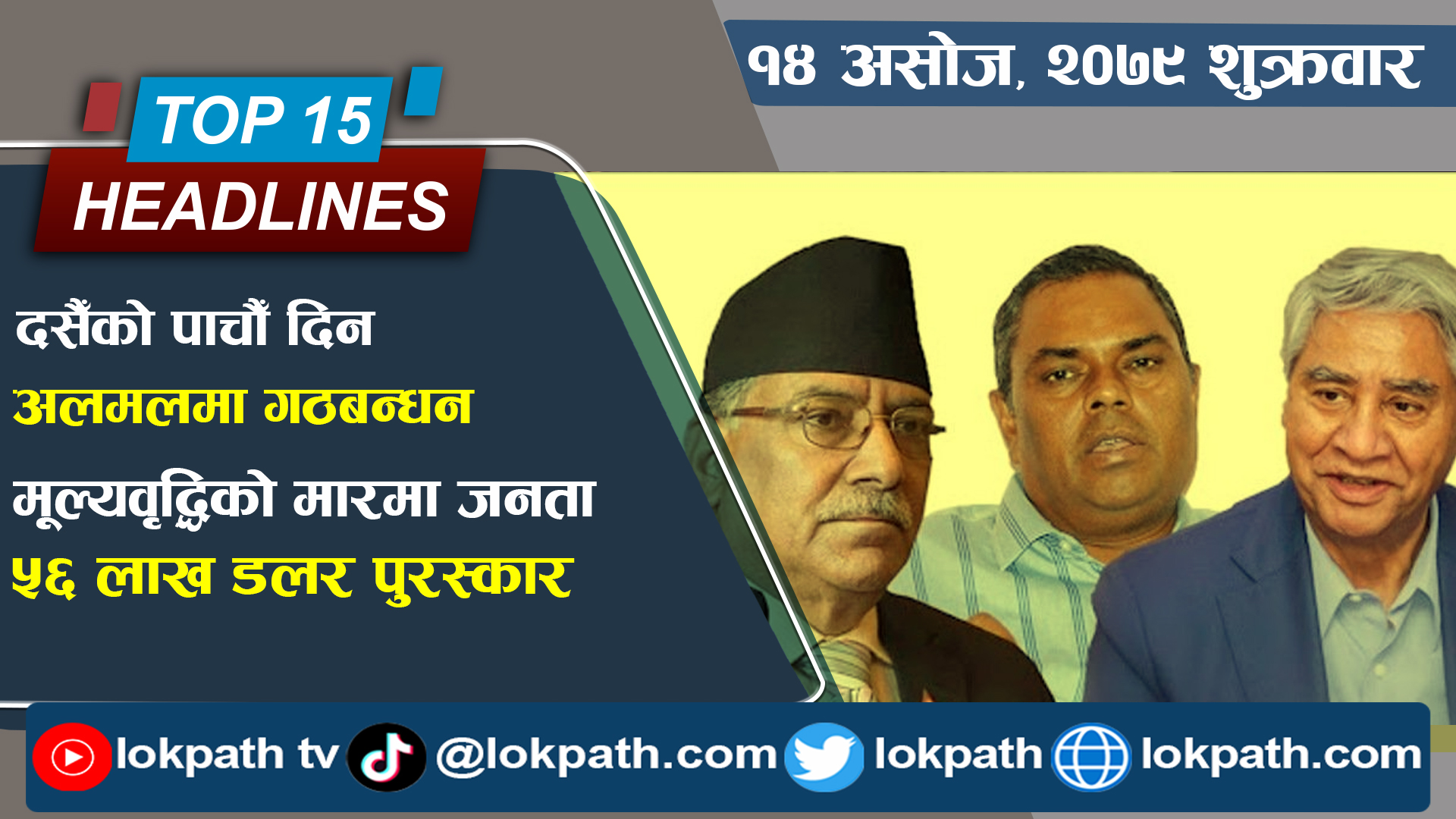 ४. वर्तमान गठबन्धन सरकारको कुनै गन्तव्य र उदेश्य नरहेको एमाले वरिष्ठ उपाध्यक्ष ईश्वर पोखरेलको आरोप, राष्ट्रिय राजनीति दुई धु्रवमा विभाजित भएको भन्दै आगामी निर्वाचनमा जनताले राम्रो पार्टीलाई जिताउने विश्वास ।