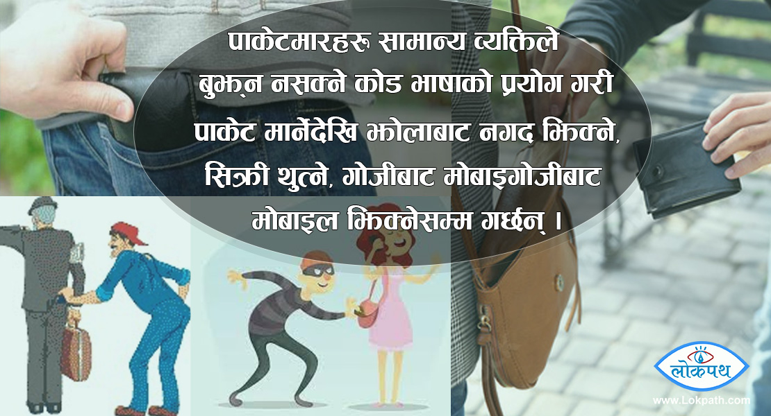 तपाईंलाई थाहा छ । सार्वजनिक सवारीमा र सार्वजनिक स्थानमा लुटपाट गर्नेहरुले प्रहरीको जस्तै कोड भाषामा कुरा गर्छन् । अरु मानिसहरुले आफ्नो चोरीको दाउ थाहा नपाउन् भनेर उनीहरुले कोड भाषा प्रयोग गरेका हुन् । पाकेटमारी घटना सुनाउँदै एकजना प्रहरी अधिकारी भन्छन्, ‘सांकेतिक भाषा बुझ्न नसक्दा सार्वजनिक यातायातका साधानमा लुटपाट बढी हुने गरेको छ ।’