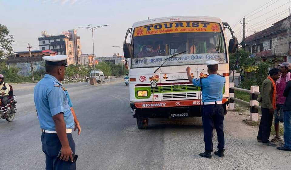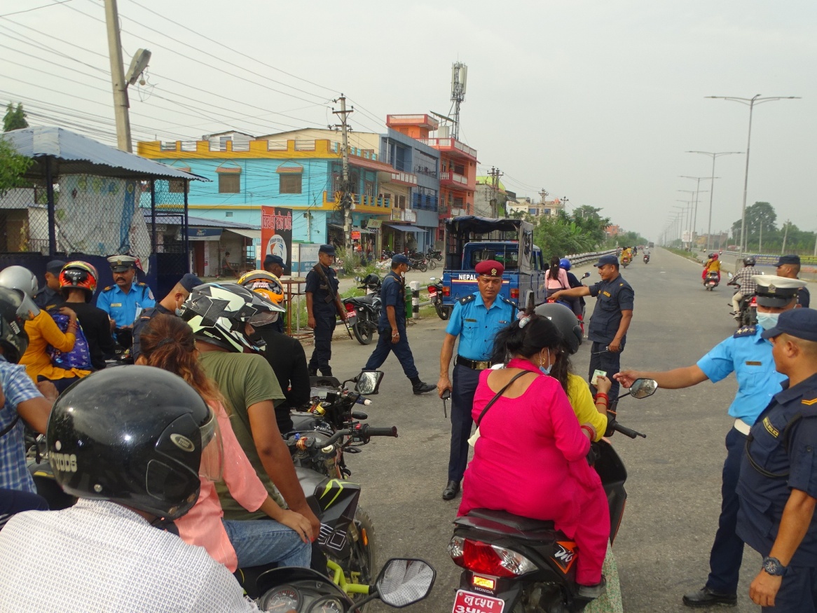 यता जिल्ला ट्राफिक प्रहरी कार्यालय रुपन्देहीले पनि दशै तिहारलाई लक्षित गर्दै लामोदुरीका सवारीसाधनमा चालकले मापसे वा लापसे गरेको छ छैन भनि चेकजाँचका साथै सवारीसाधनको यन्त्रिक चेकजाँच पनि गरिरहेकोे छ । सिमा क्षेत्र बेलहिया र भैरहवा वसपार्कबाट छुटेका गाडीहरुलाको चालकलाई ब्रेथलाइजरबाट मापसे र किटबाट लागुऔषध सेवन गरेको चेकजाच गरिरहेका ३ दिनबाट भइरहेको जिल्ला ट्राफिक प्रहरी कार्यालय रुपन्देहीका प्रमुख केशव केसीले बताए ।।