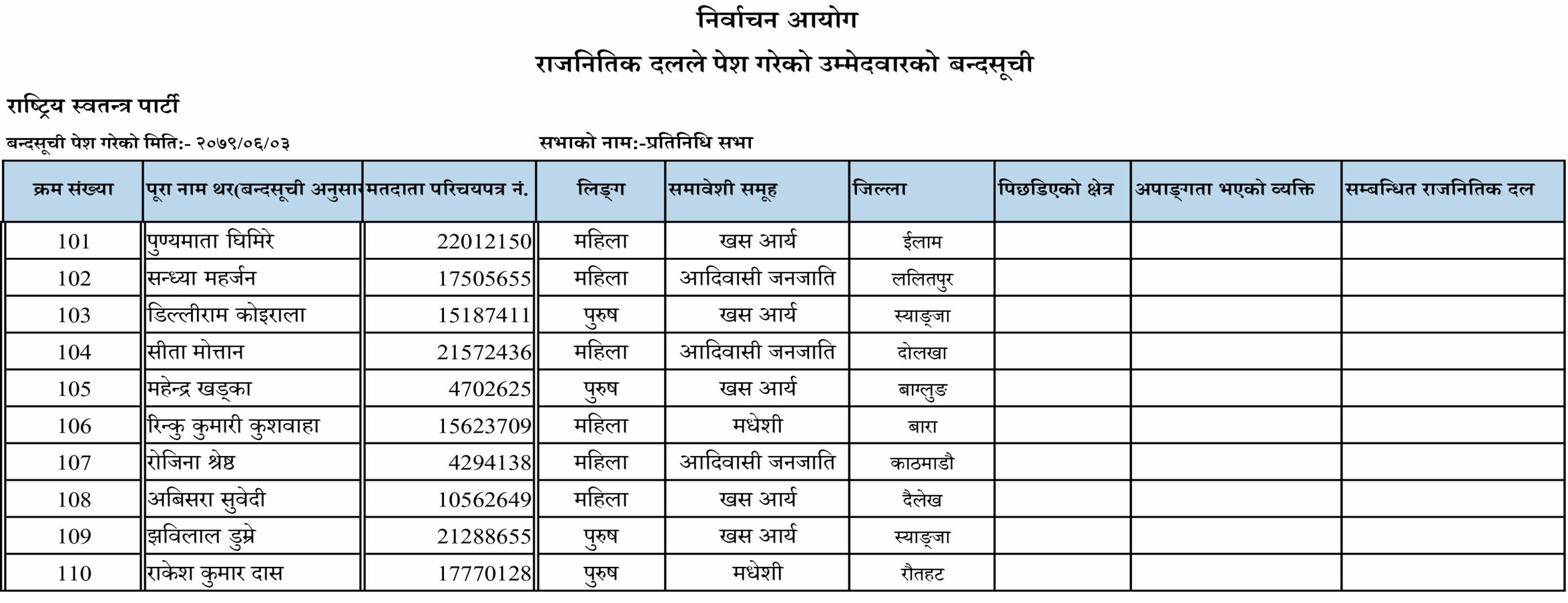 जसअनुसार प्रतिनिधिसभातर्फका समानुपातिक उम्मेदवारहरूको पहिलो नम्बरमा डा. ढाकाकुमार श्रेष्ठको नाम सिफारिस गरिएको छ । राष्ट्रिय स्वतन्त्र पार्टीले आदिवासी जनजाति, खसआर्य, मधेशी, मुस्लिम, दलित, थारु, अपांगतासहितका उम्मेदवारलाई स्वतन्त्र पार्टीले समाबेशी सूचीमा राखेको छ ।