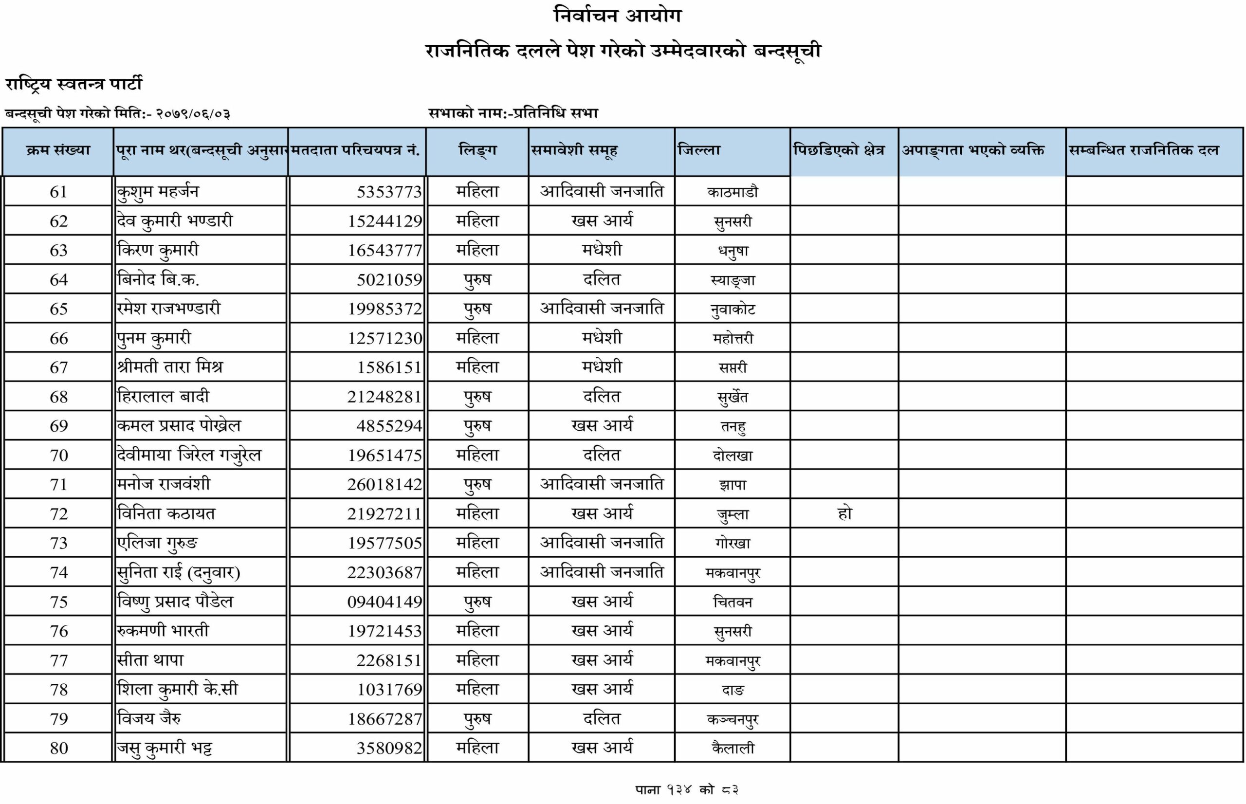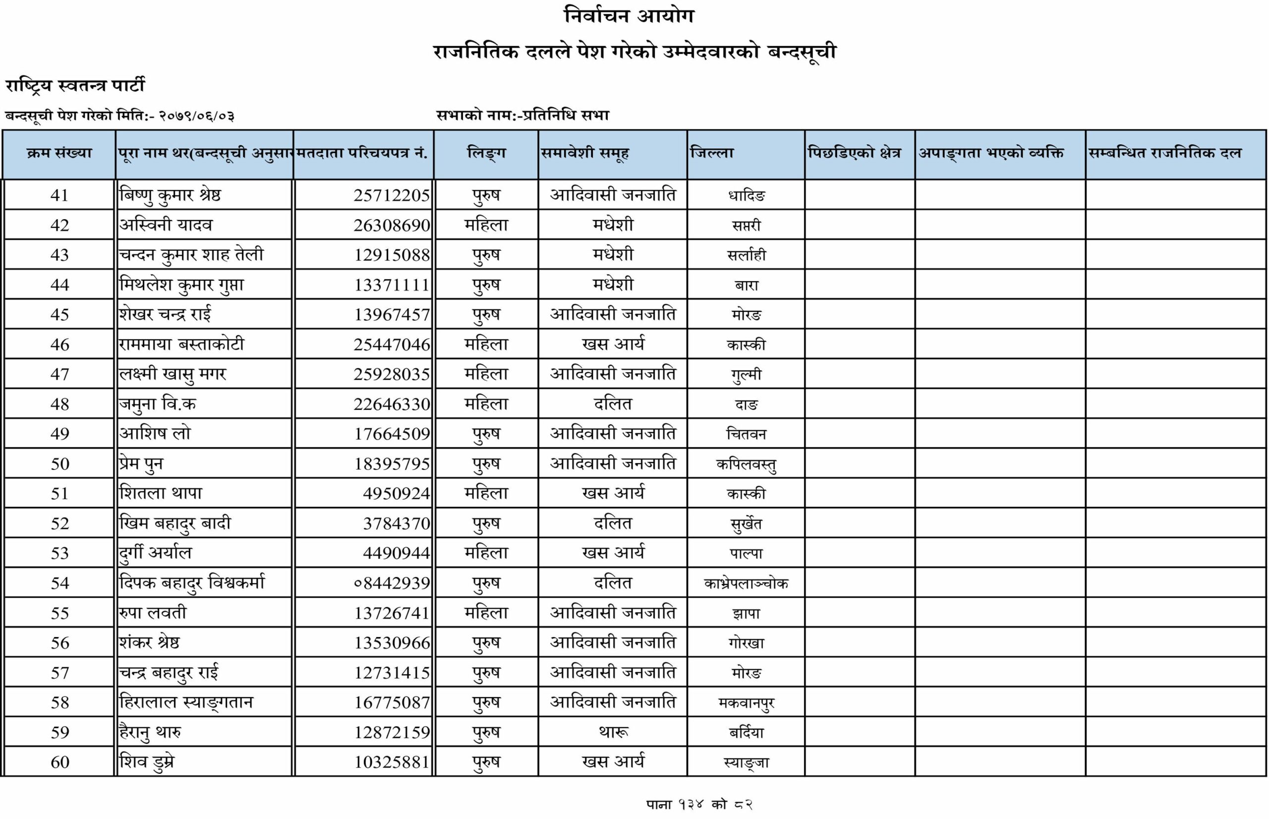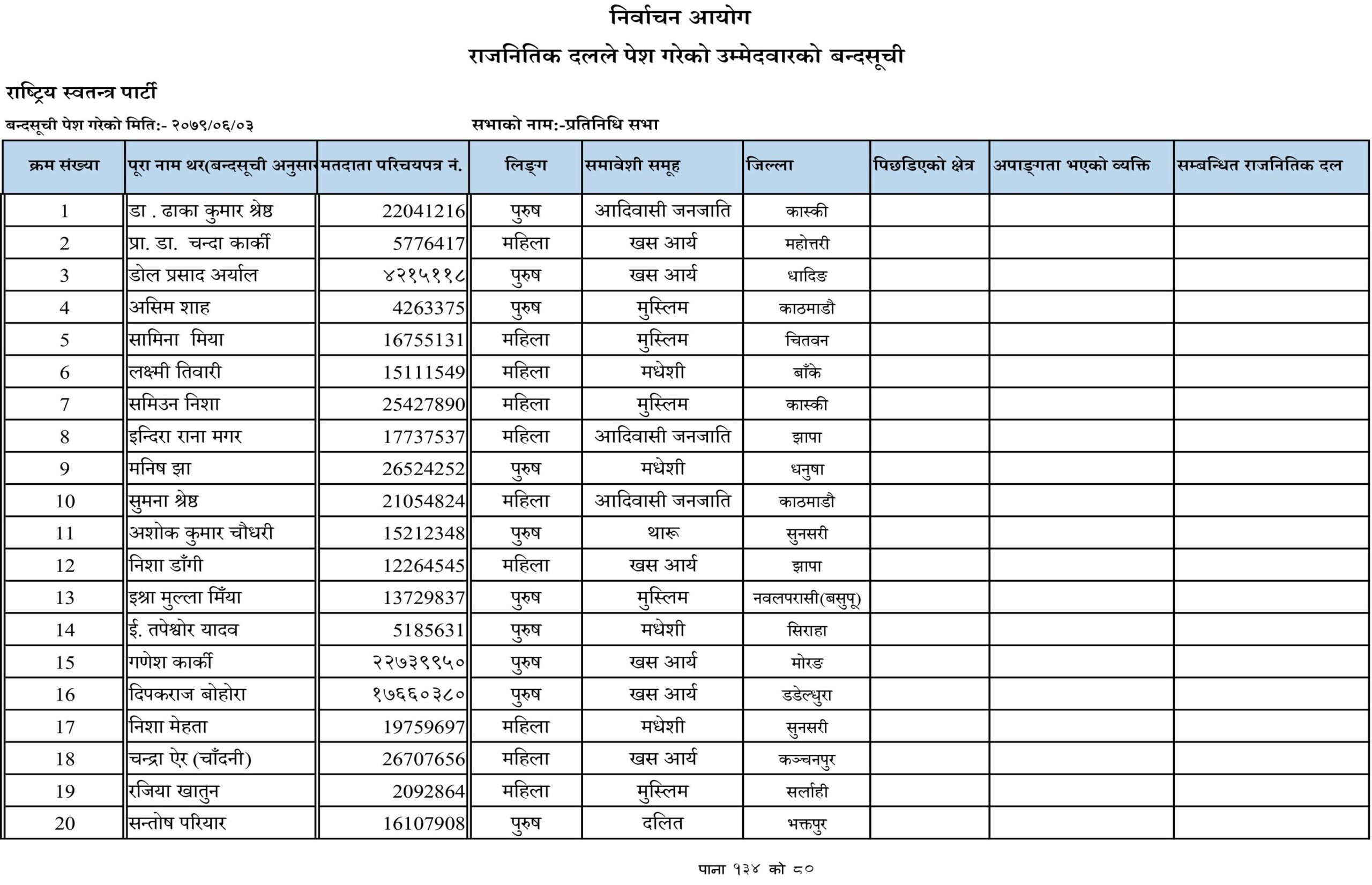 जसअनुसार प्रतिनिधिसभातर्फका समानुपातिक उम्मेदवारहरूको पहिलो नम्बरमा डा. ढाकाकुमार श्रेष्ठको नाम सिफारिस गरिएको छ । राष्ट्रिय स्वतन्त्र पार्टीले आदिवासी जनजाति, खसआर्य, मधेशी, मुस्लिम, दलित, थारु, अपांगतासहितका उम्मेदवारलाई स्वतन्त्र पार्टीले समाबेशी सूचीमा राखेको छ ।