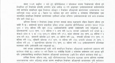 मुख्य निर्वाचन अधिकृत र निर्वाचन अधिकृतको कार्यालयमा उत्साहजनक तथा शान्तिपूर्ण रुपमा मनोनयन दर्ता भएको भएको भन्दै आयोगले निर्वाचन कार्यालयमा उपस्थित भएका कतिपय उम्मेदवारहरूको दर्ता कार्य हालसम्म पनि जारी रहेको जनाएको छ ।