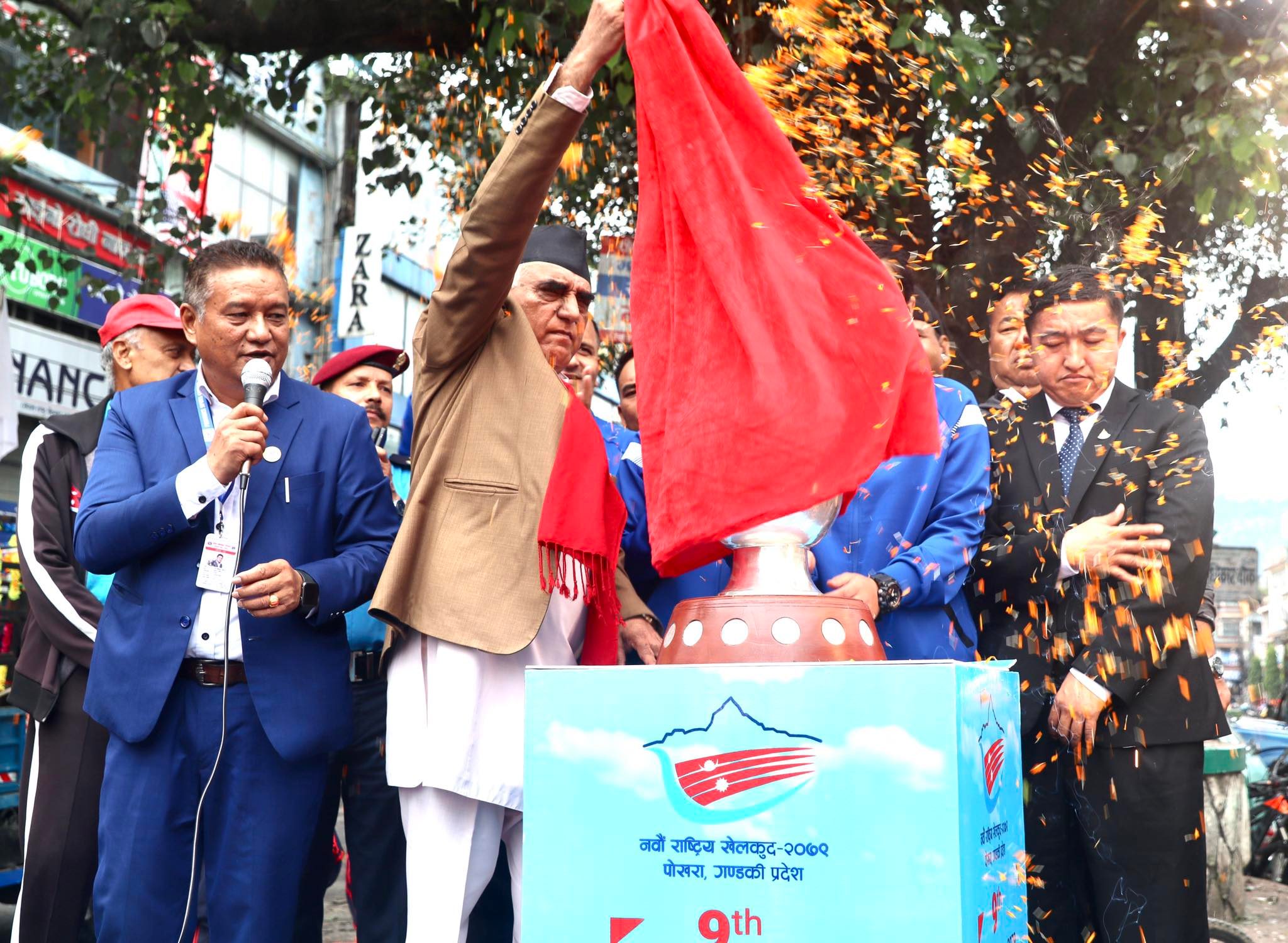 पोखरा । नवौं राष्ट्रिय खेलकुद प्रतियोगिताको छेकोमा पहिलो पटक राष्ट्रिय खेलकुद प्रतियोगिताको ट्रफी तयार गरिएको छ । उक्त ट्रफी पोखराबाट सार्वजनिक भएको छ ।