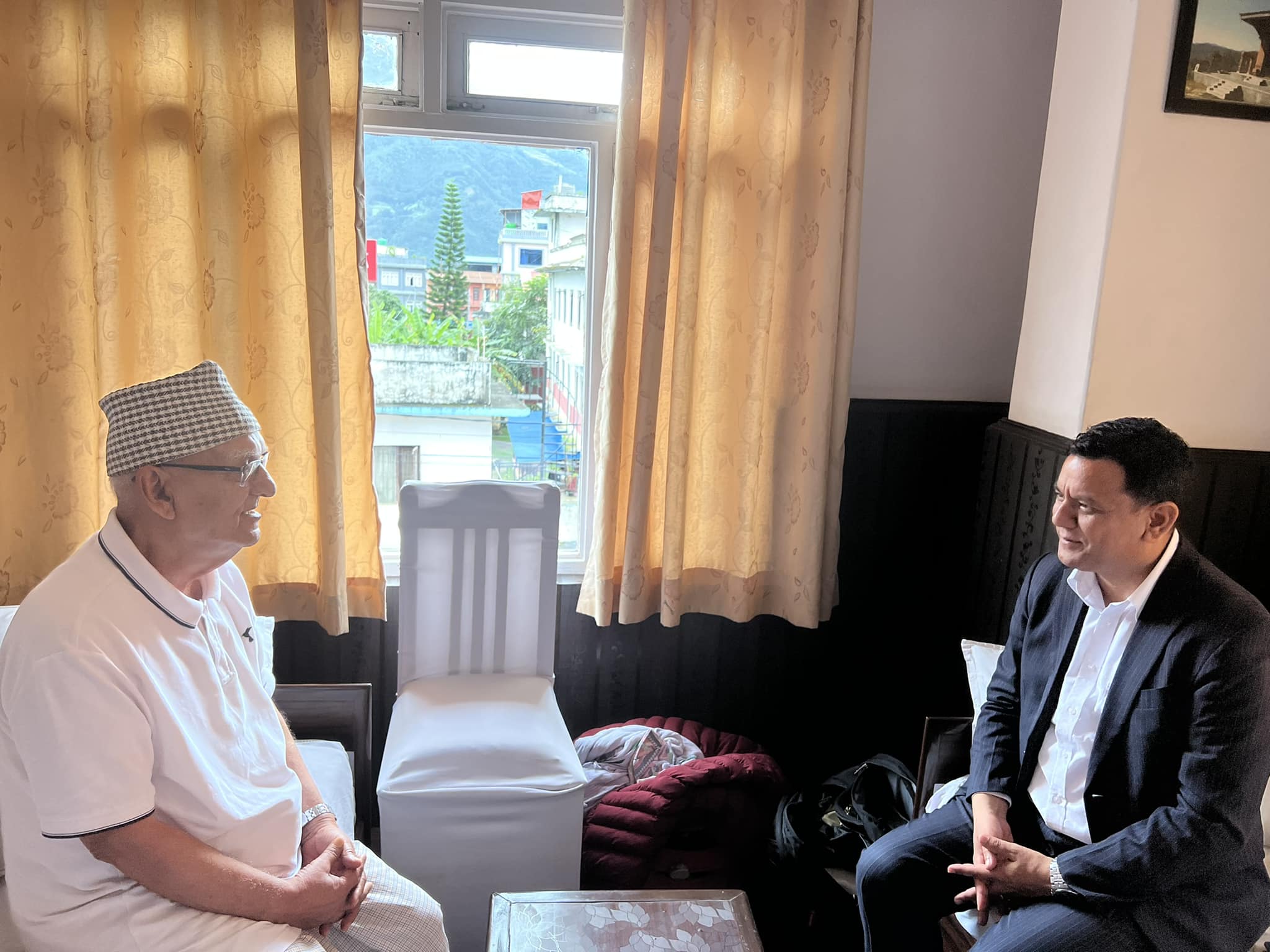 एनले सामाजिक सञ्जालमा लेखेका छन्, ‘मुलुकको राष्ट्रिय राजनीति , आसन्न निर्वाचन , मित्रवत प्रतिस्पर्धा लगायत बिषयमा गठबन्धनका उम्मेदवार आदरणिय चित्र बहादुर के सी ज्यु सित छलफल गर्दै । समय दिनुभएकोमा धन्यवाद।’