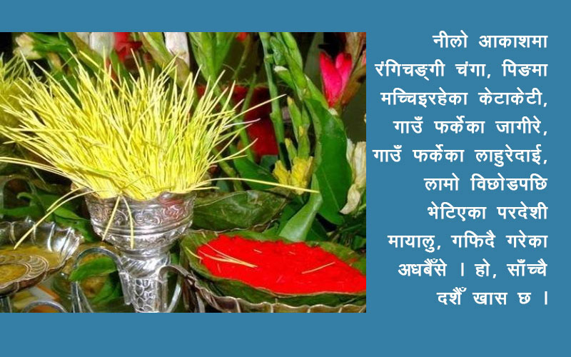 नीलो आकाशमा कोही चंगा उडाइरहेका छन्, कोही पिङमा मच्चिइरहेका छन्, शहरमा अस्थायी बसोबास गर्नेहरु घर–गाउँ फर्किएका छन् । सर्वत्र उल्लास छाएको छ । त्यसैले त, दशैँ आएको छ । त्यसैले त यसको महत्व अत्याधिक छ । नीलो आकाशमा रंगिचङगी चंगा, पिङमा मच्चिइरहेका केटाकेटी, गाउँ फर्केका जागीरे, लामो विछोडपछि भेटिएका परदेशी मायालु, गफिदै गरेका अधबैँसे ।