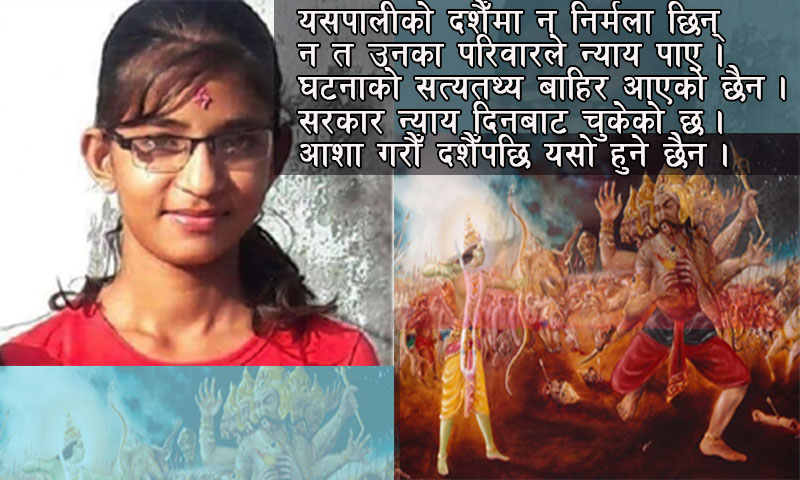 देश भर असत्यमाथि सत्यको विजय स्वरुप विजय दशमी मनाउँदै छन् भने बलात्कारपछि हत्या गरिएकी कञ्चनपुरकी १३ वर्षीया बालिका निर्मलाले न्याय पाउनुमा अन्यौल देखिएको छ ।