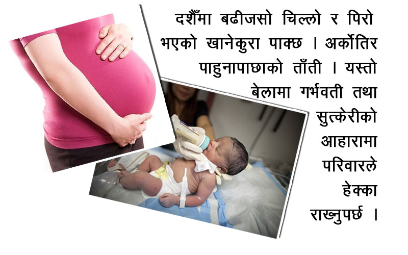 जब गर्भमा बच्चा रहन्छ, तब गर्भवतीको शारीरिक र मानसिक स्वास्थ्य स्वस्थ्य हुनु जरुरी छ । किनकी गर्भवती महिला स्वस्थ्य नभएमा गर्भको बच्चामा सोझो प्रभाव पार्छ । बच्चाको राम्रो मानसिक र शारीरिक विकासका लागि पनि गर्भावस्थामा ख्याल राख्नु पर्छ । उनीहरु सकारात्मक, खुसी, सुखी भए गर्भको बच्चामा त्यसको प्रभाव पर्छ । यद्यपी गर्भवती आफुले मात्र चाहेर सबै कुराको ख्याल राख्न सक्दैनन् । त्यसैले घरको परिवारले पनि गर्भवती महिलाको ख्याल राख्नु जरुरी छ । झन् चाडपर्वमा पाहुनापाछाको व्यवस्थापनमा लाग्दा गर्भवती तथा सुत्केरीले उचित खान पाएका छन् कि छैनन् पनि विचार पुर्याउनुपर्छ ।