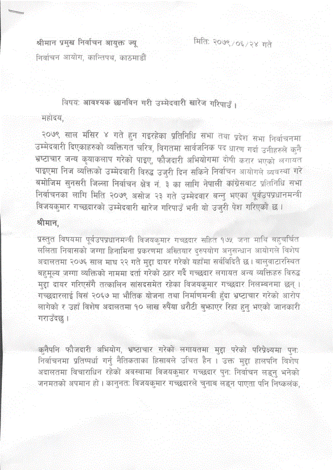 काठमाडौं । नेपाली कांग्रेसका नेता विजयकुमार गच्छदारको प्रतिनिधिसभा सदस्य पदको उम्मेदवारी खारेजीको माग राख्दै उजुरी परेको छ । आइतवार गच्छदारले सुनसरी ३ बाट उम्मेदवारी लड्ने गरी मनोनयन दर्ता गरेका थिए ।
